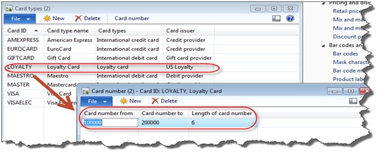 - In the Card number form, define the start and end of the number sequence for the card. Additionally, specify the number of digits that Microsoft Dynamics AX for Retail POS checks to determine whether a card number is valid.
